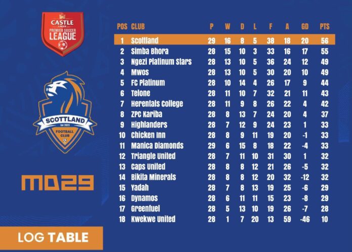 The crucial win lifts Scotland FC to 56 points from 29 matches, edging one point clear of reigning champions Simba Bhora, who are inactive this weekend.